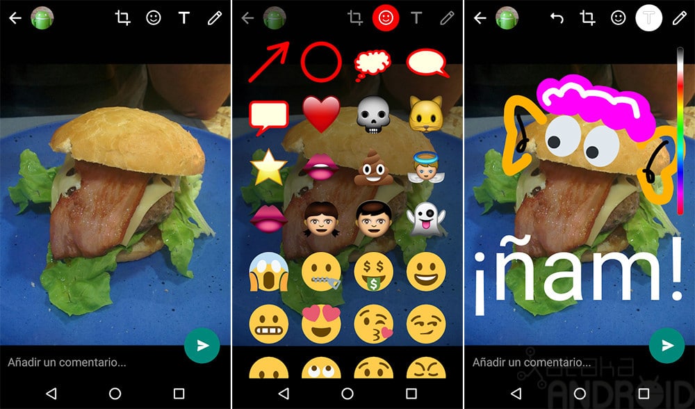 Ahora cuando usemos la cámara de Wasap al hacer una foto o vídeo (los vídeos se pueden convertir a .gif y compartirlos) podremos escribir, dibujar o añadir emoticonos sobre ella. En la parte de arriba aparecen las opciones disponibles: cara para añadir emoticonos de mayor tamaño, T para añadir texto, lápiz para dibujar nosotros, cuadrícula para redimensionar y colocar elementos de la foto. Usando la cámara de Wasap además podremos hacer zoom al grabar un vídeo, usar el flash en los selfies,…Destacamos también la mejora de la accesibilidad con nuevos botones dedicados para hacer la foto o reenviar imágenes y vídeos de forma directa.
