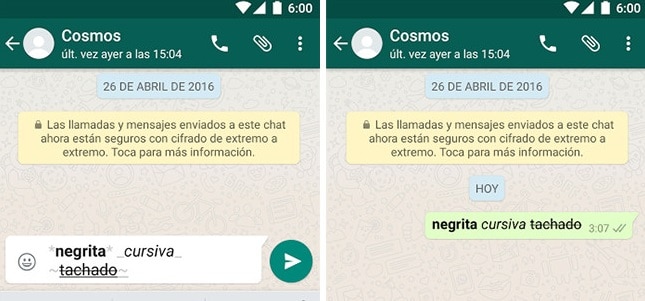 Colocando el texto entre caracteres especiales: *negrita*, _cursiva_ o ~tachado~ o combinarlos a la vez.