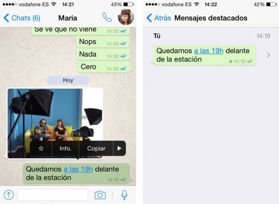 Para destacar un mensaje mantén pulsado el mensaje y selecciona la estrella de la parte superior de la pantalla. Para dejar de destacar el mensaje sigue el mismo proceso. Para ver los mensajes destacados Menú => Mensajes destacados